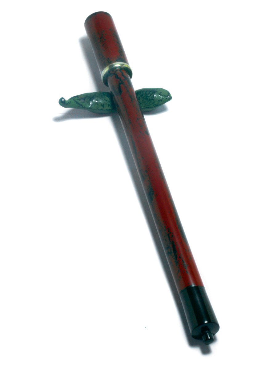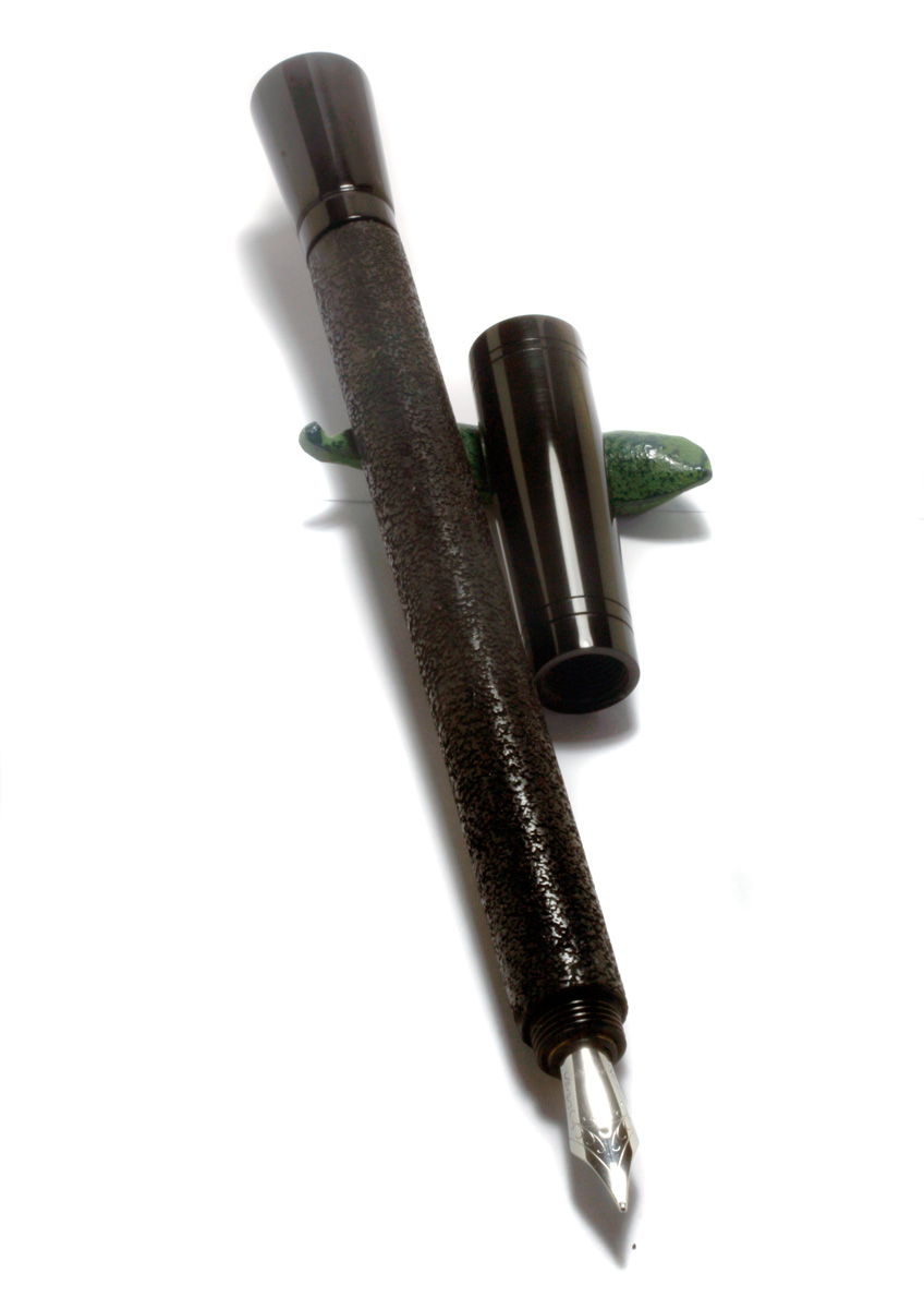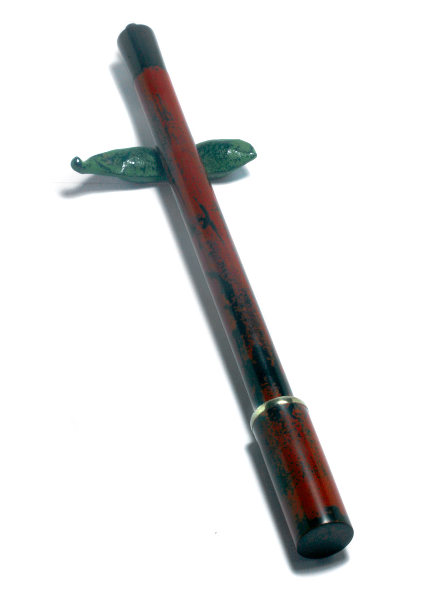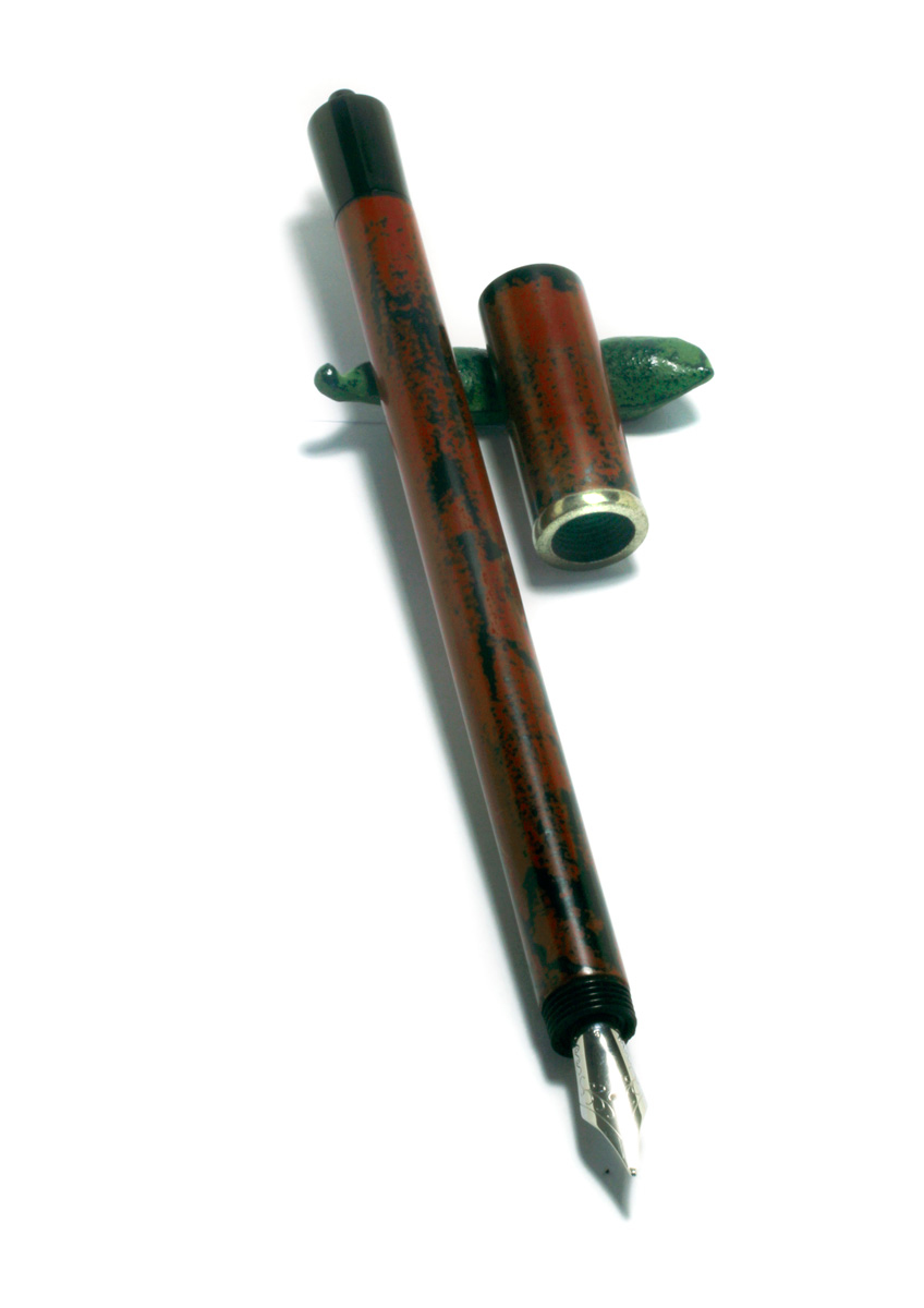 An eye-dropper fountain Pen in the shape of a ink brush with a tank containing 14 ml of ink. barrel, cap and endpiece made from Ebonite, lacquered with urushi lacquer. Total Length 21 cm, diameter barrel 12 mm respectively 14 mm
