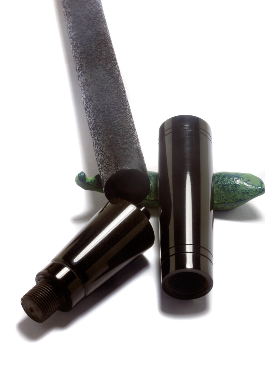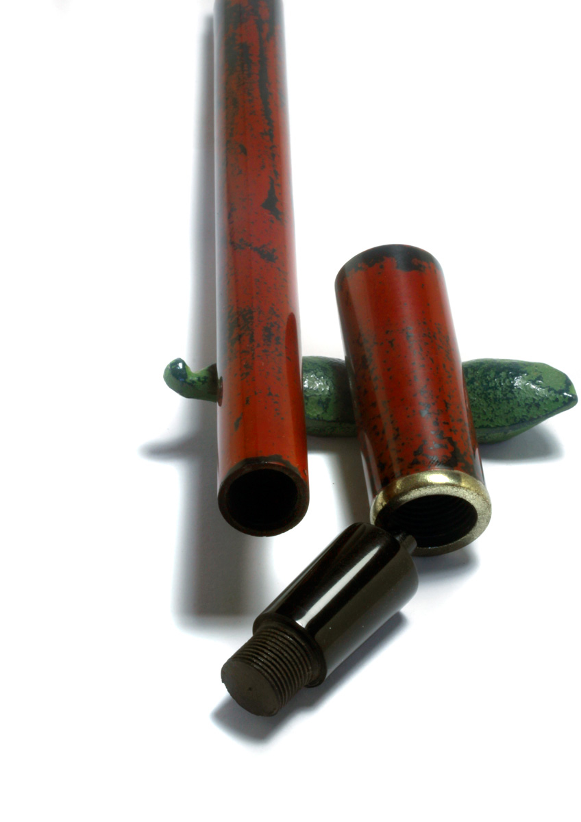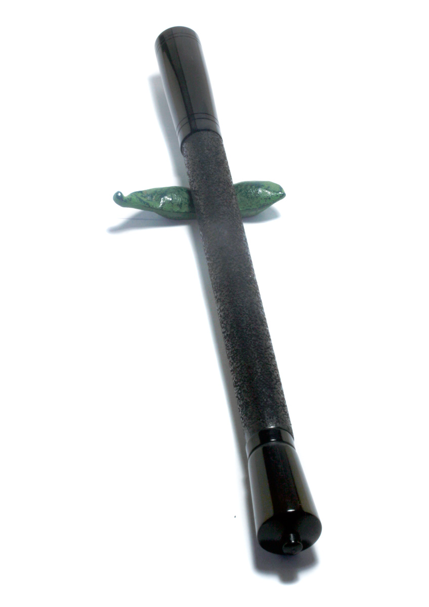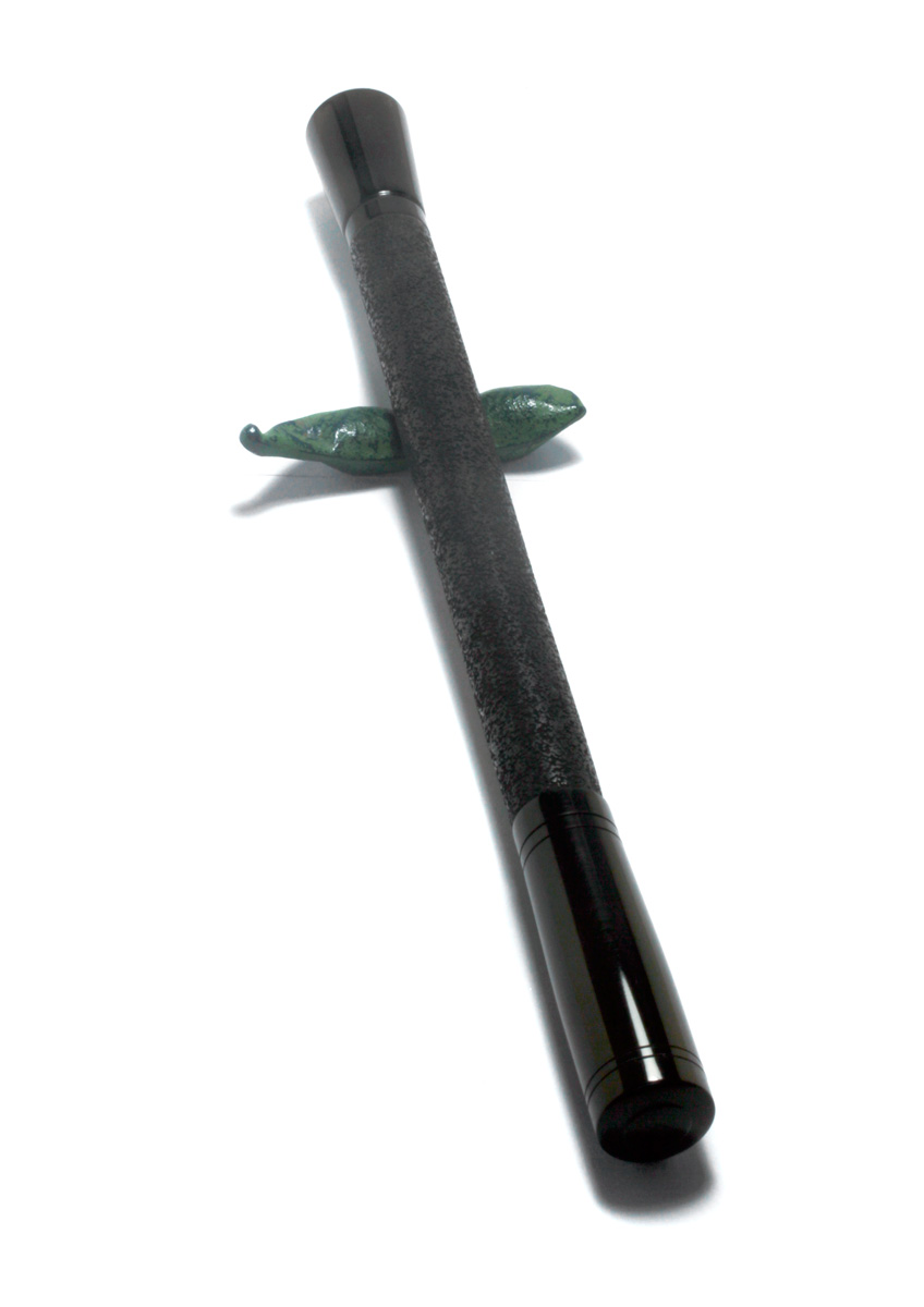 An eye-dropper fountain Pen in the shape of a ink brush with a tank containing 14 ml of ink. barrel, cap and endpiece made from Ebonite, lacquered with urushi lacquer. Total Length 21 cm, diameter barrel 12 mm respectively 14 mm