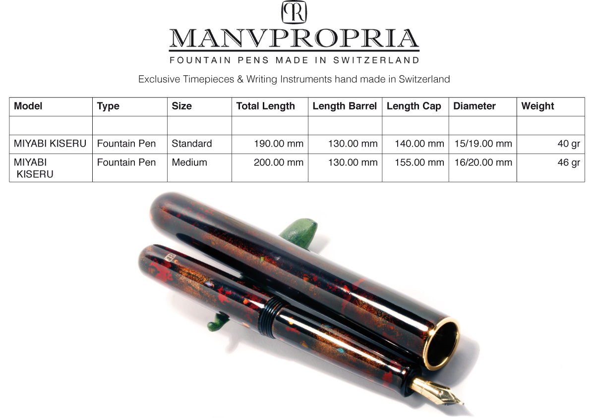 Ebonite Fountain Pens with Urushi Lacquer Finish hand made in small serial for direct order and retail. Note that shape, length and diameter of barrel and cap can vary slightly. The Miyabi Kiseru Pens are available in over 100 different Lacquers