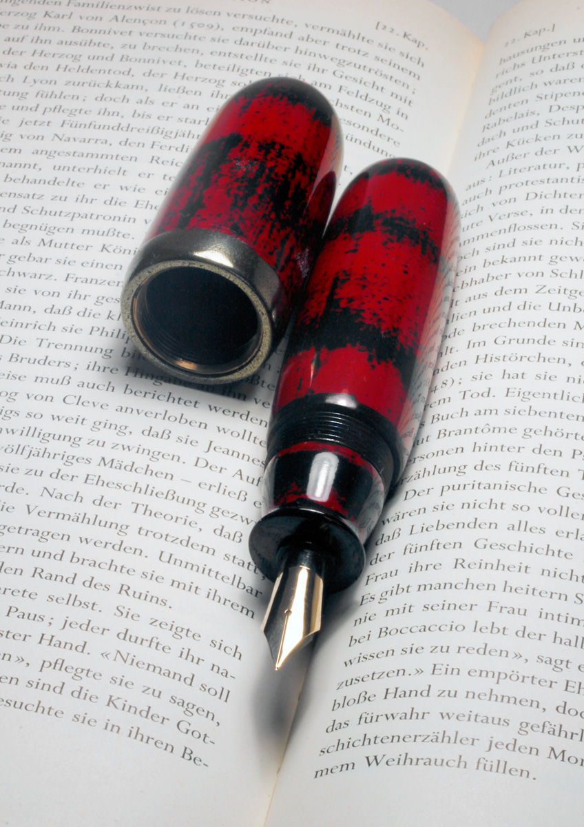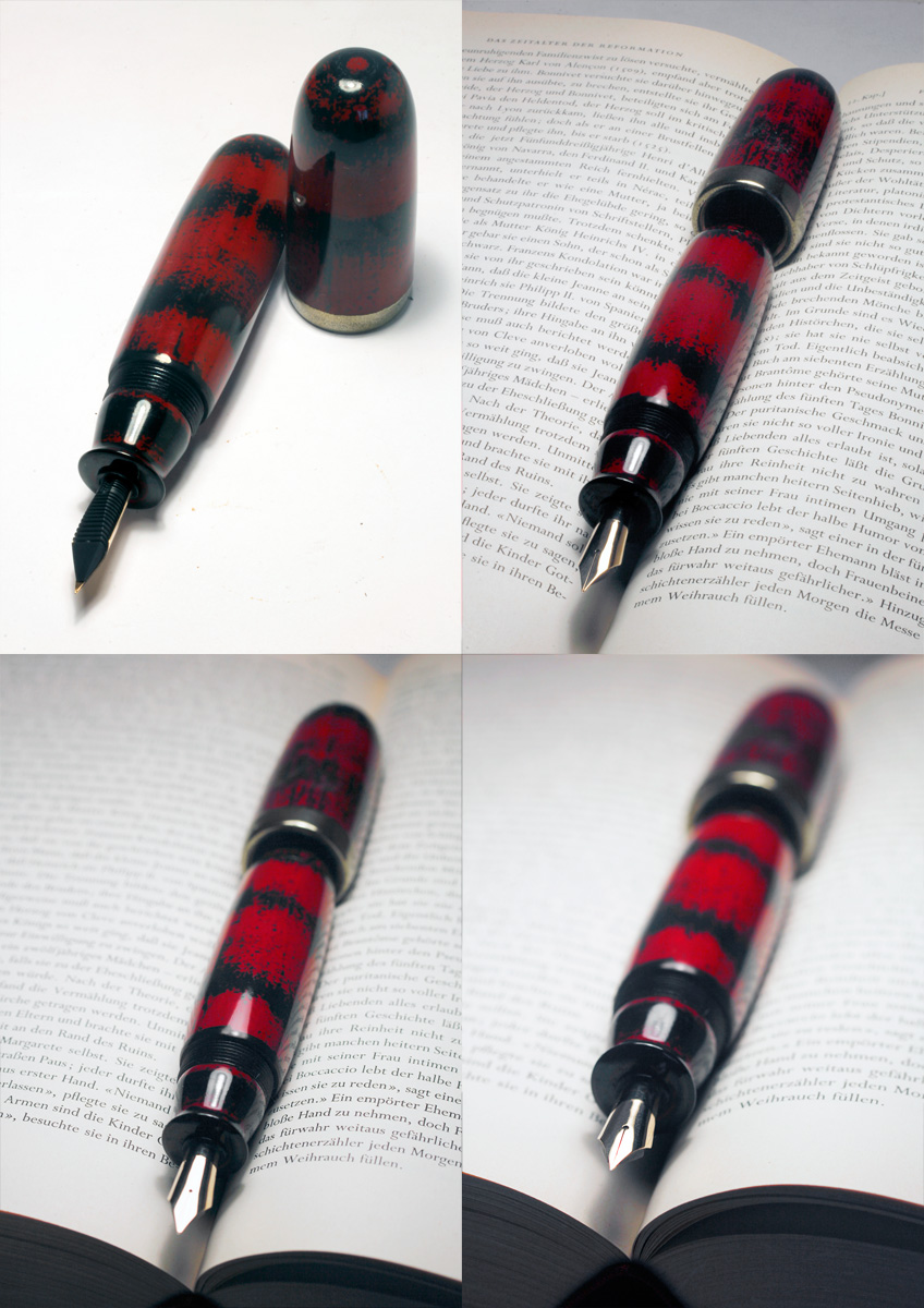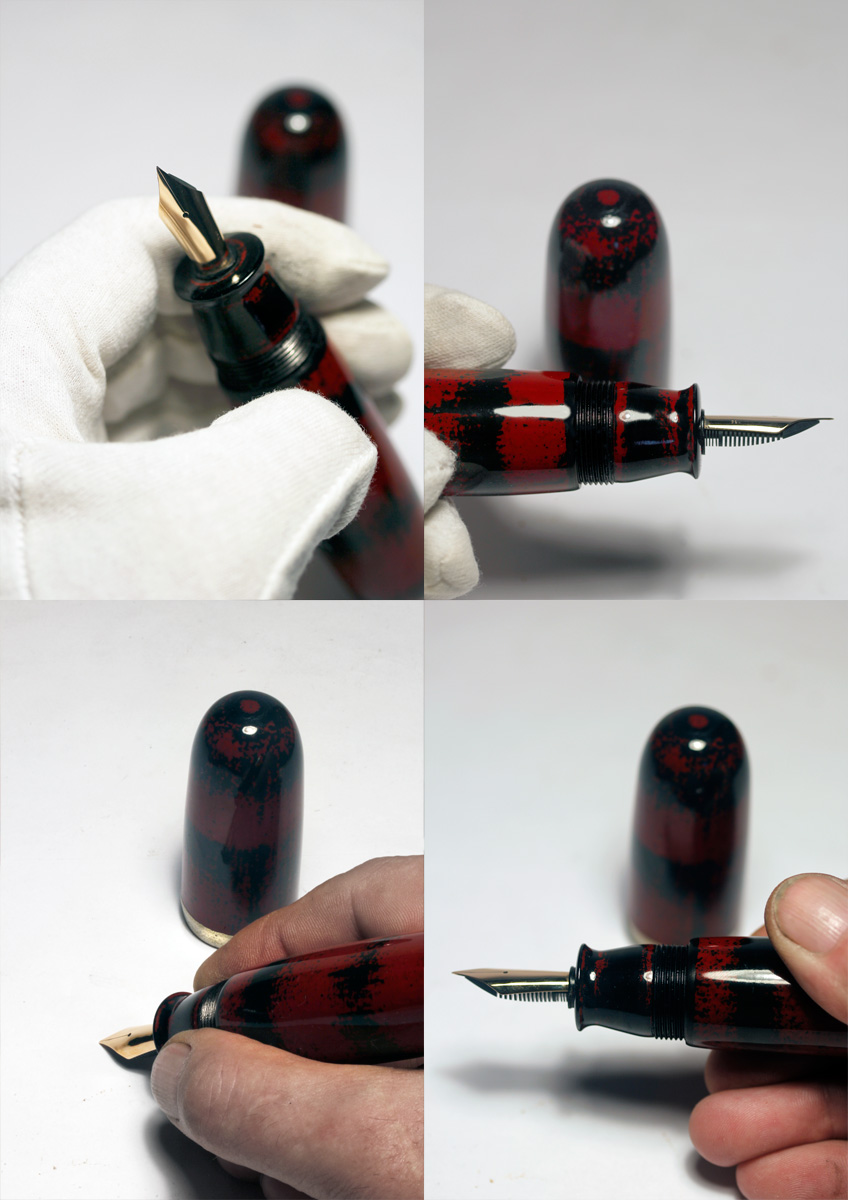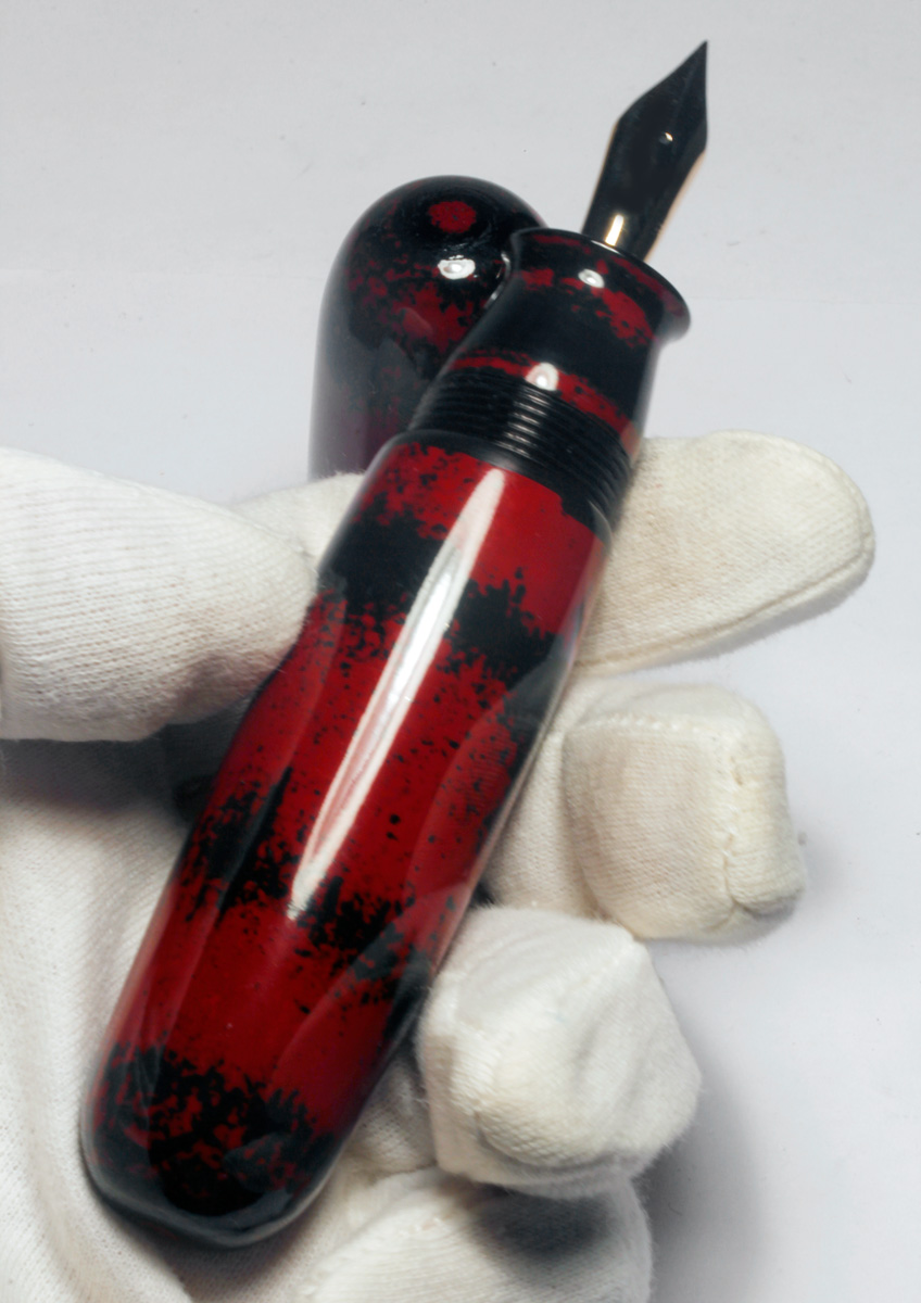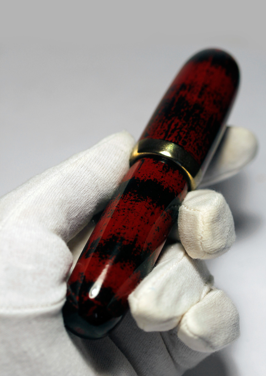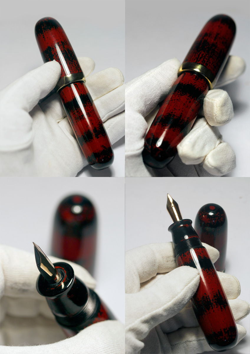 The pen body manufactured from Ebonite. Total length: 120 mm, length barrel with nib 115 mm, diameter barrel 24 mm, Diameter cap: 27 mm. The golden band on the cap is made from urushi and brass powder (Kinsoku Mitateai) to imitate hammered solid brass. The case made from Aluminum with an ebonite lid and lacquered with urushi.