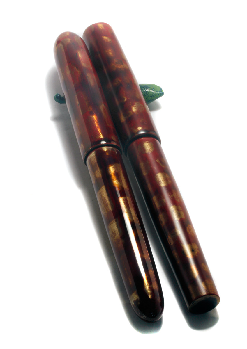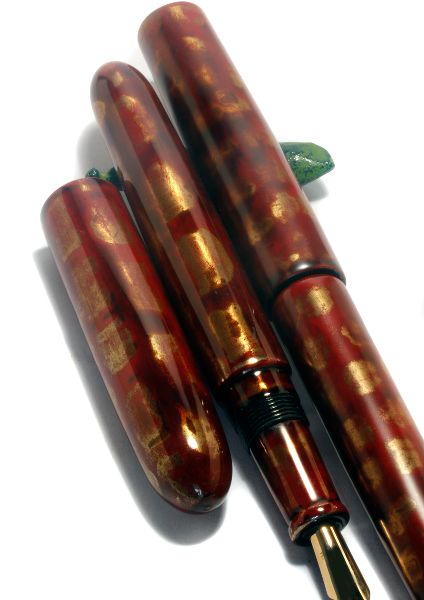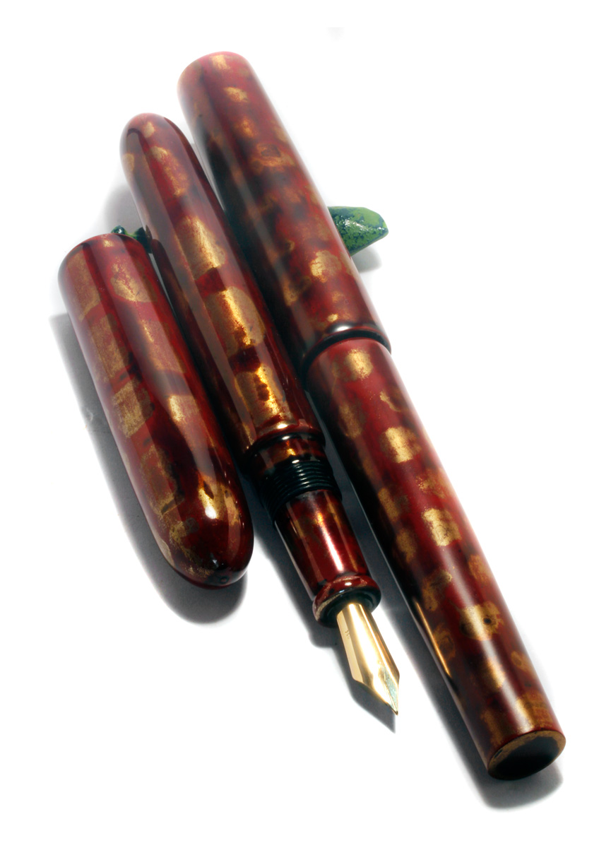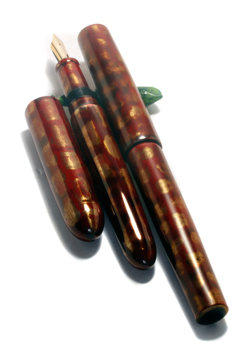 Hammered flat gold nuggets are laid into still wet “Shû Neri” red urushi lacquer.