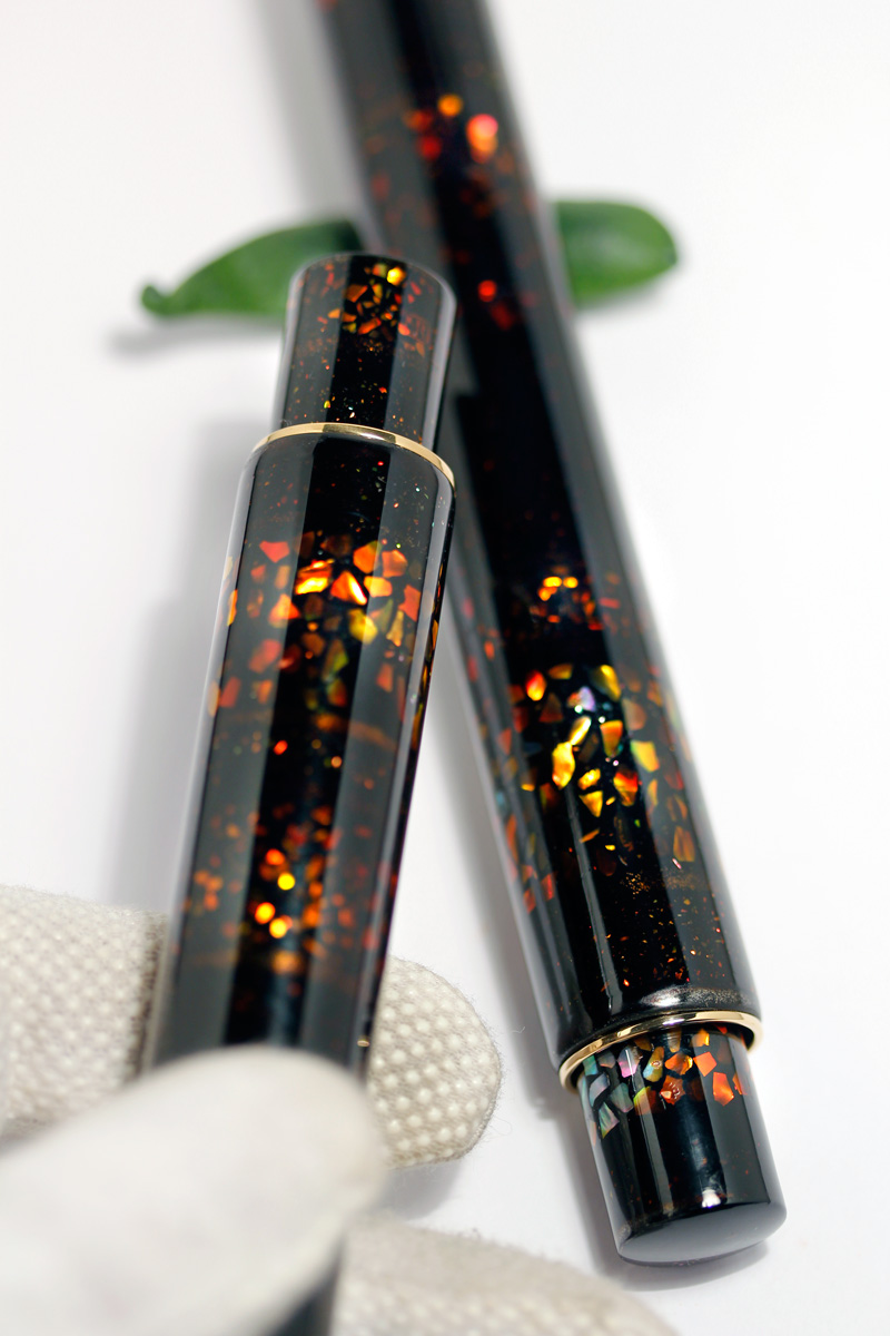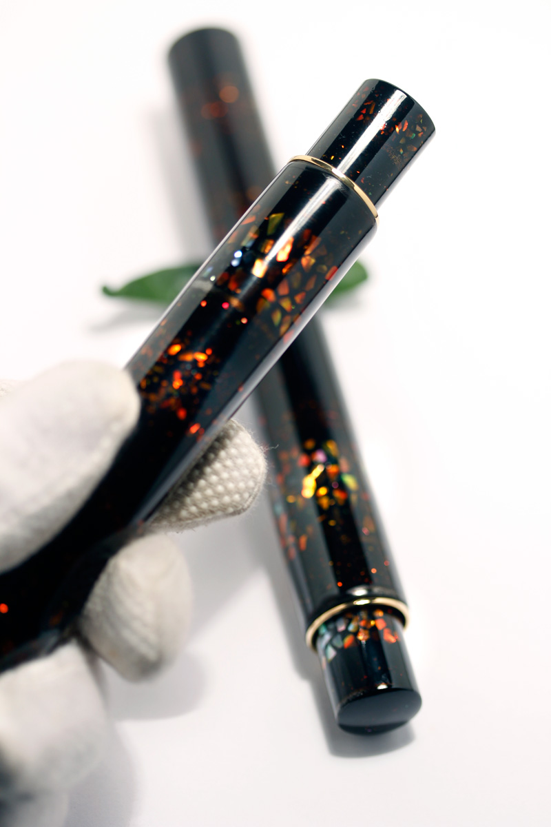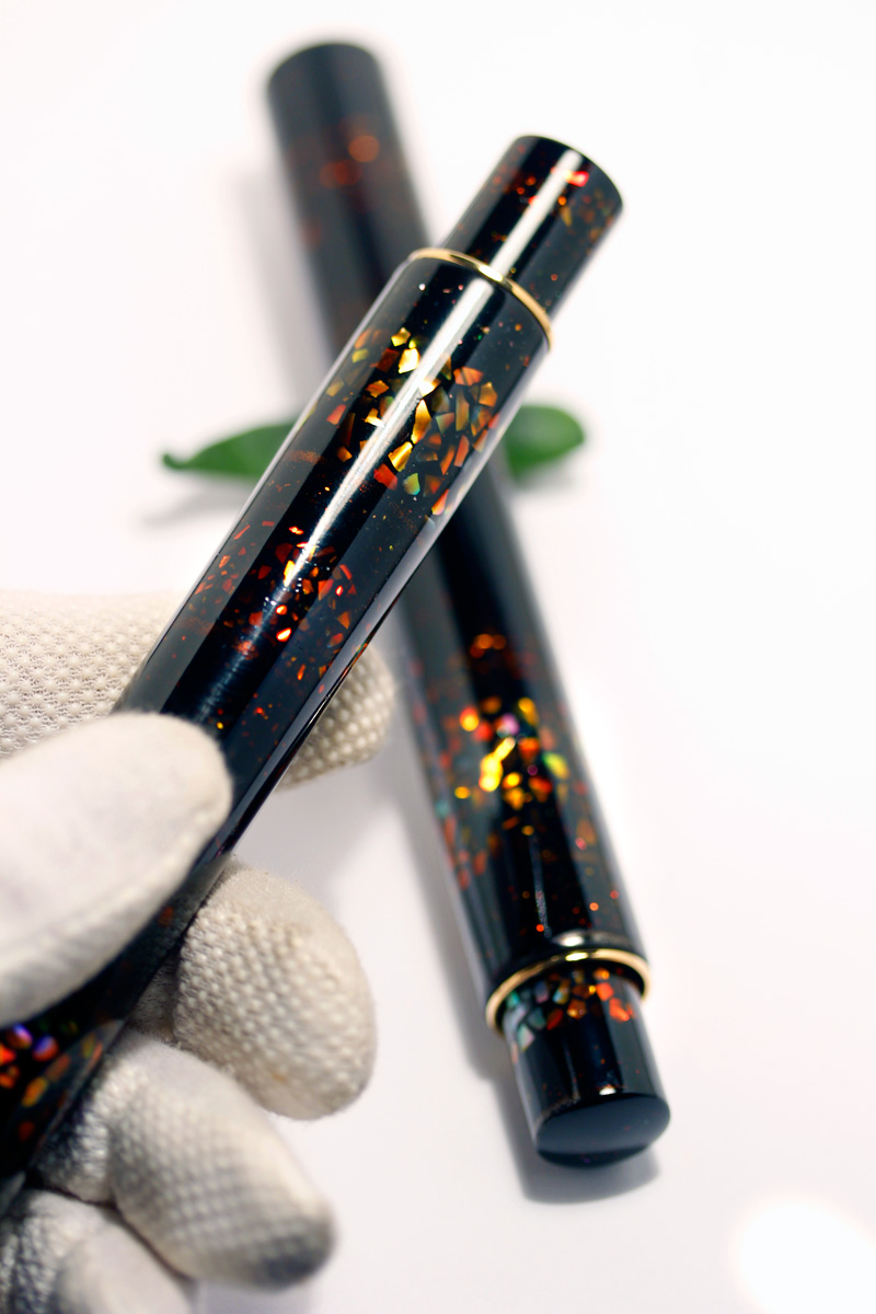 Tame-Raden-Nuri Aogai Lit. mother of pearl, Ra = Mother of Pearl, Den = Sprinkle, Tame = final coat of transparent "sakari-urushi" lacquer