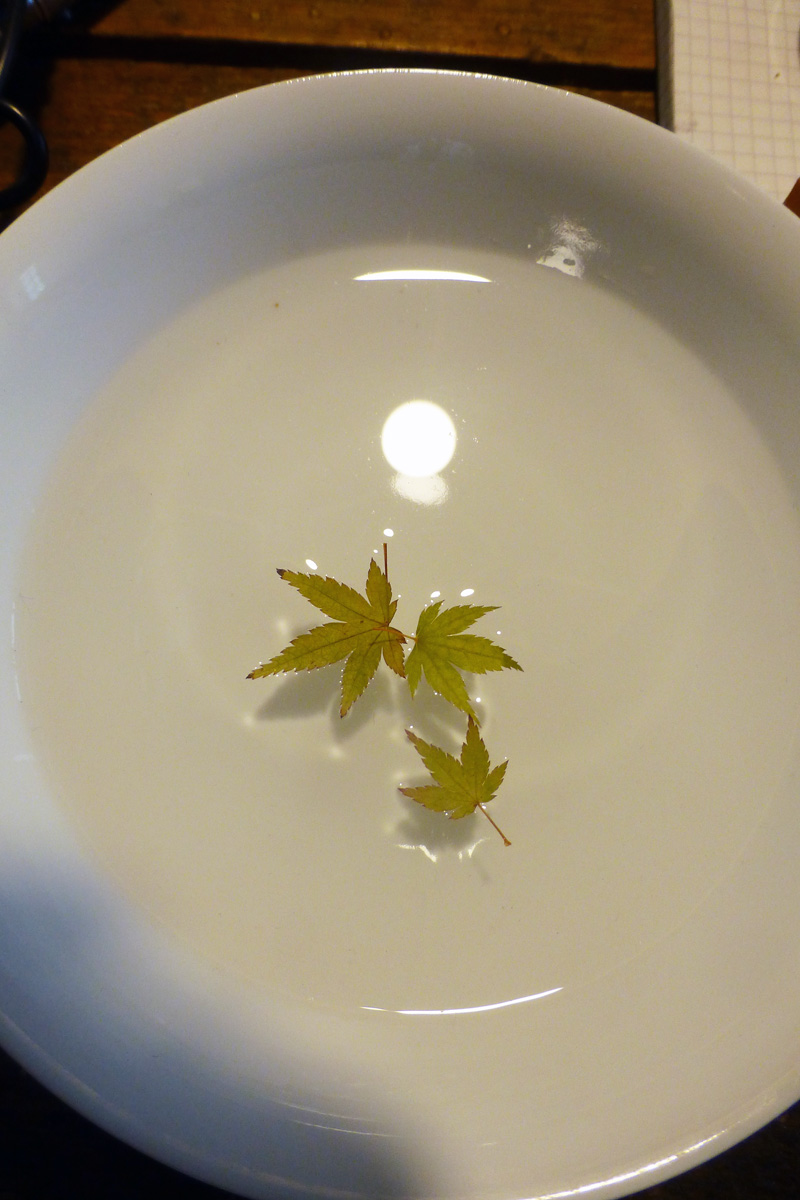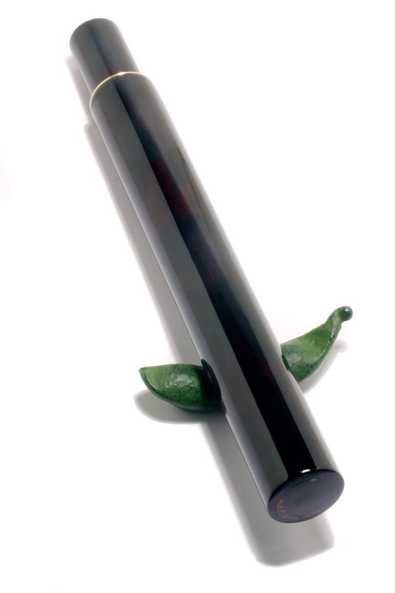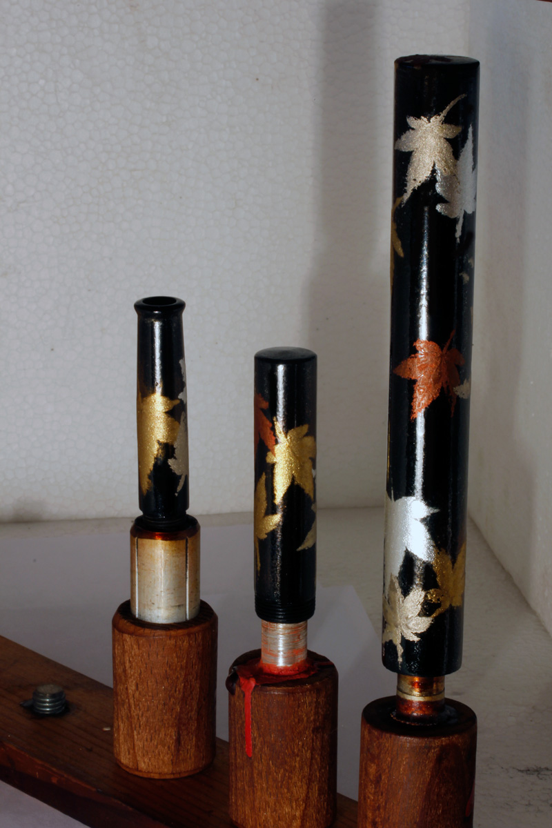 Tame Momiji-Maki-e - Nama-Ha-Suri-Nuri is a technique in which leafs of plants are painted with strongly pigmented urushi and pressed on urushi lacquer ground to leave the leaf‘s pattern. Momiji-Maki-e-Nuri is one version where „Momiji“ Japanese Maple leafs are used. The remaining urushi is sprinkled with various metal powders, in this case gold, platinum and copper. Some are left pure red and orange urushi. The whole work is then coated with 15 layers of transparent urushi. The leaf pattern are shimmering through the Tame layer. Since urushi becomes more transparent with the time, the pattern will appear stronger