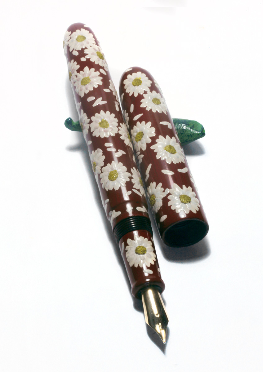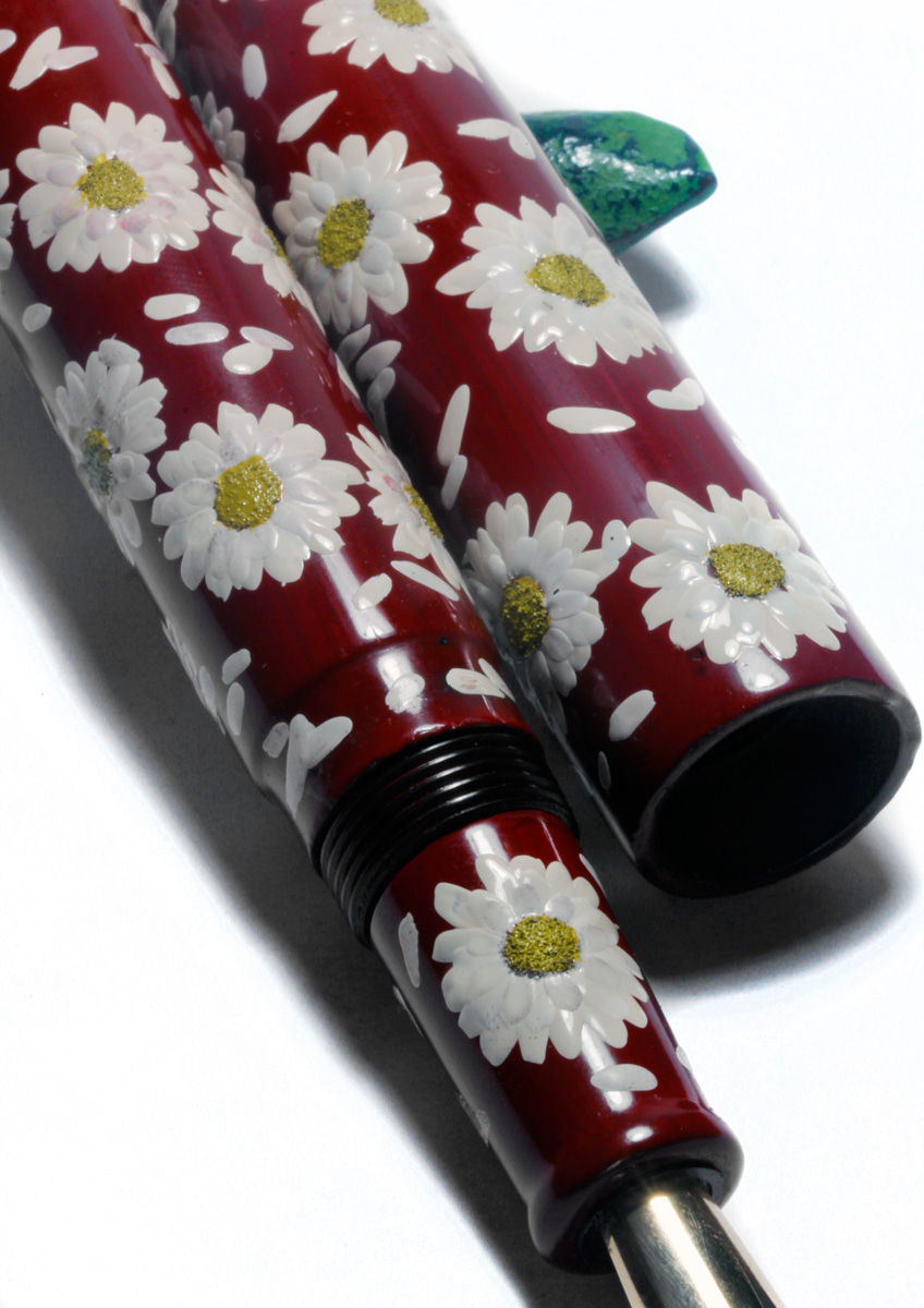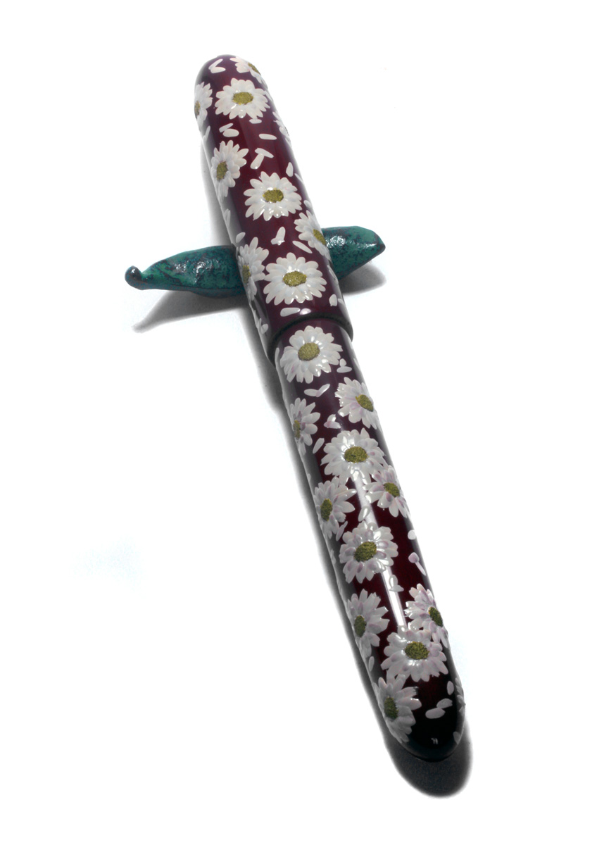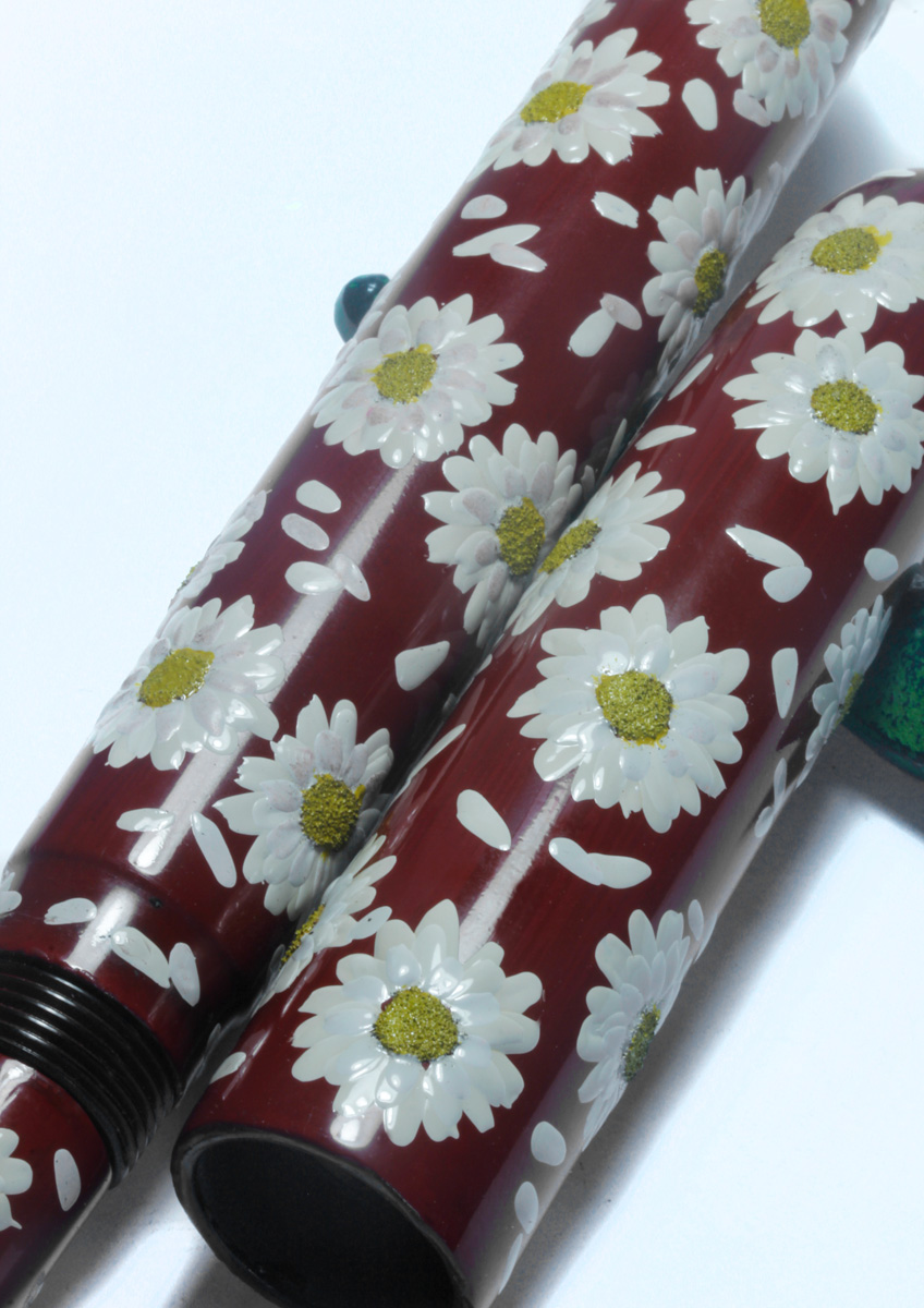 Recently I made some experiments with white urushi for making flower petals. Now I have finished the first pen with daisy flower heads built from white and yellow urushi. The intense color is achieved by mixing titanium white respectively Cadmium yellow pigments into transparent urushi. The mixture is 8 parts pigments to 2 parts urushi. Since the paste became very thick I could only apply it at warm temperature of 50ºC