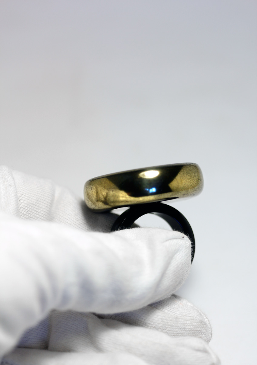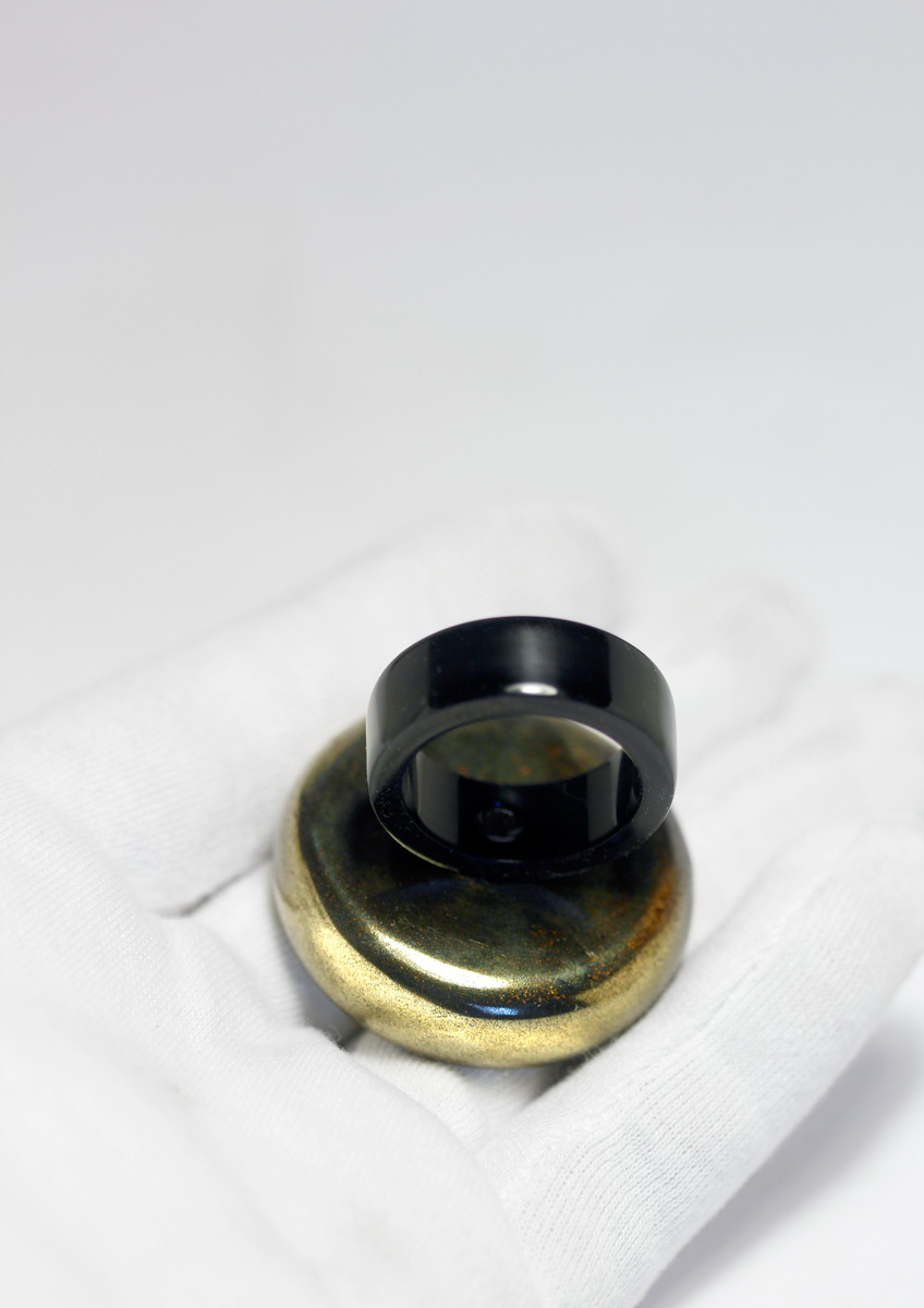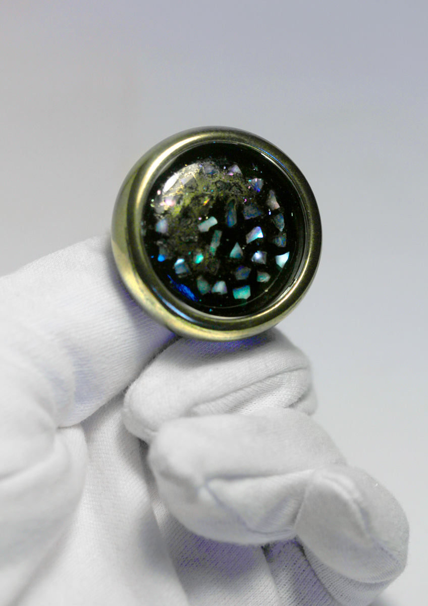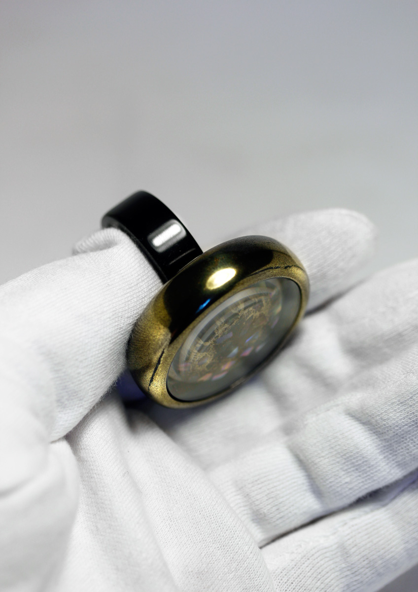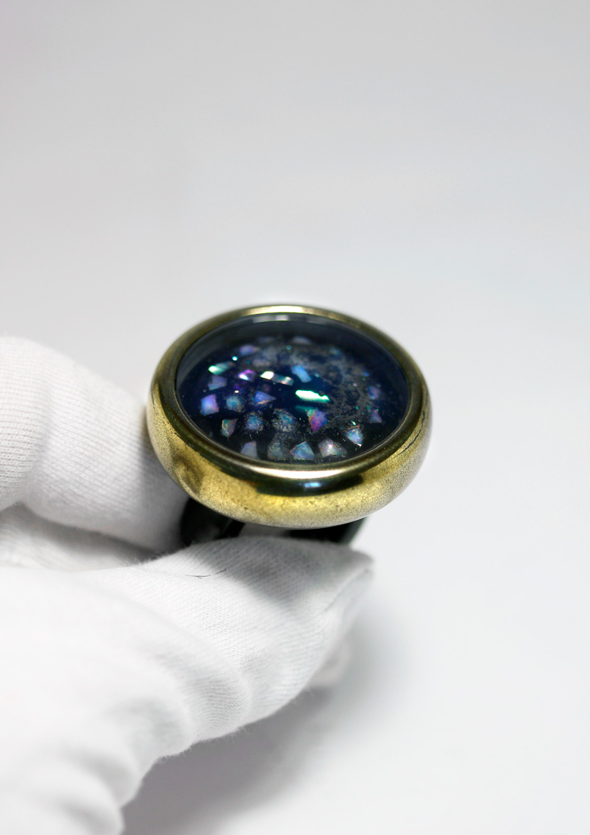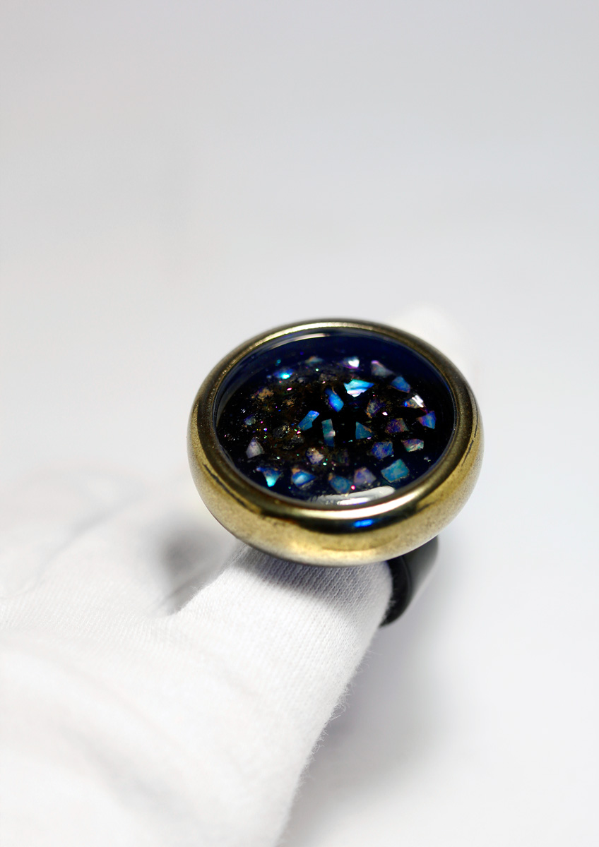A Ring with a poetic interworld. Ebonite body lacquered with «Sentoku-Nuri» Urushi Lacquer. The Interworld a Medallion with large sparkling Raden flakes, the poetic interworld protected by a gold frame and sapphire crystal. The Ring bar made from polished Japanese Ebonite. The weight 26 gr. Diameter 40 mm
